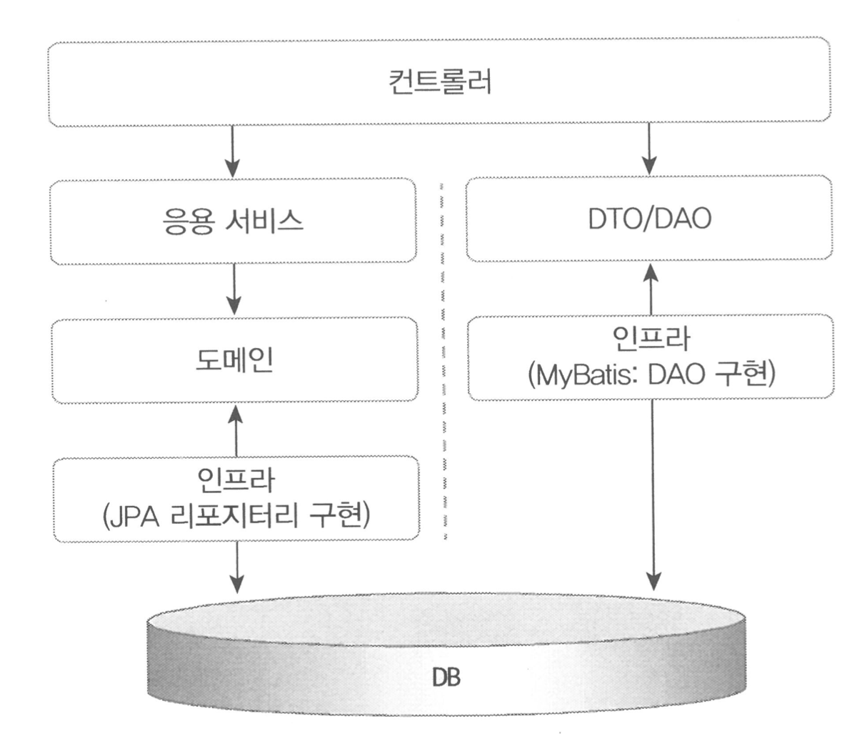 위를 보면, 조회 모델에서는 응용 서비스가 존재하지 않는다. 단순히 데이터를 읽어아 조회하는 기능은 응용 로직이 복잡하지 않기 때문에 컨트롤러에서 바로 DAO를 실행해도 무방하다.