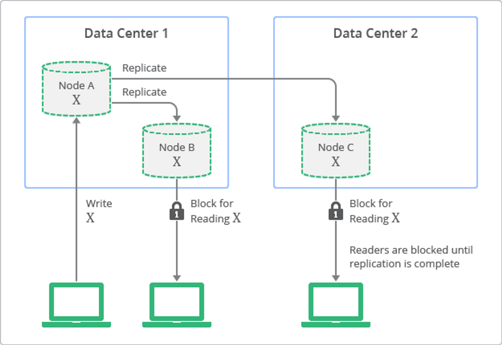 위의 다이어그램은 복제본을 읽는 것은 언제든 가능하지만, 일부 복제본은 특정 시점에 상위 노드에 쓰여진 값과 일치하지 않을 수 있음을 알 수 있다.