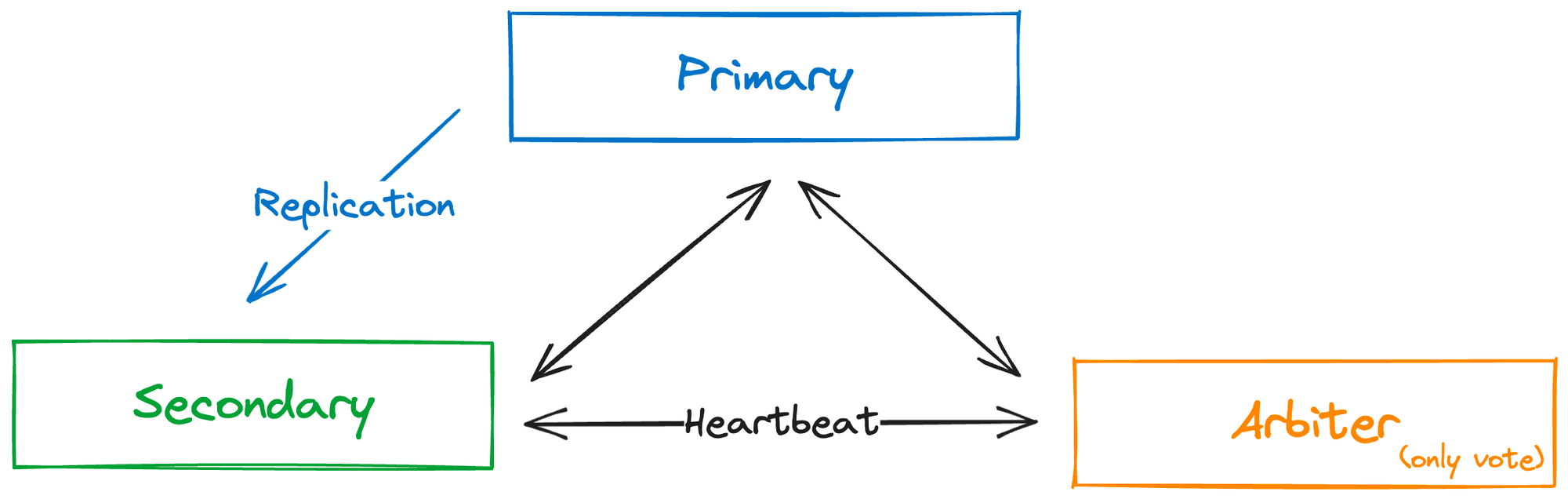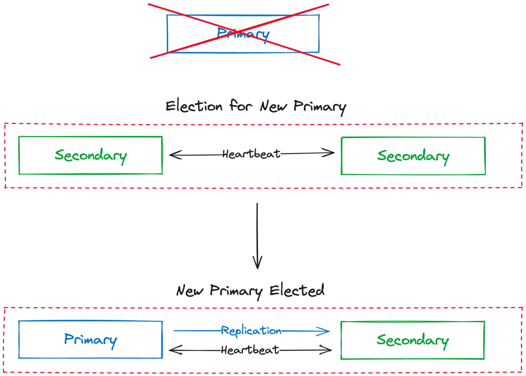 내부적으로 각 멤버들은 서로 Heartbeat를 통해 살아있는지 수시로 확인한다. 만약에 Primary에게 Heartbeat 요청을 했는데, 답변이 없으면 선출 알고리즘을 통해 새롭게 Primary를 선출하게 된다.