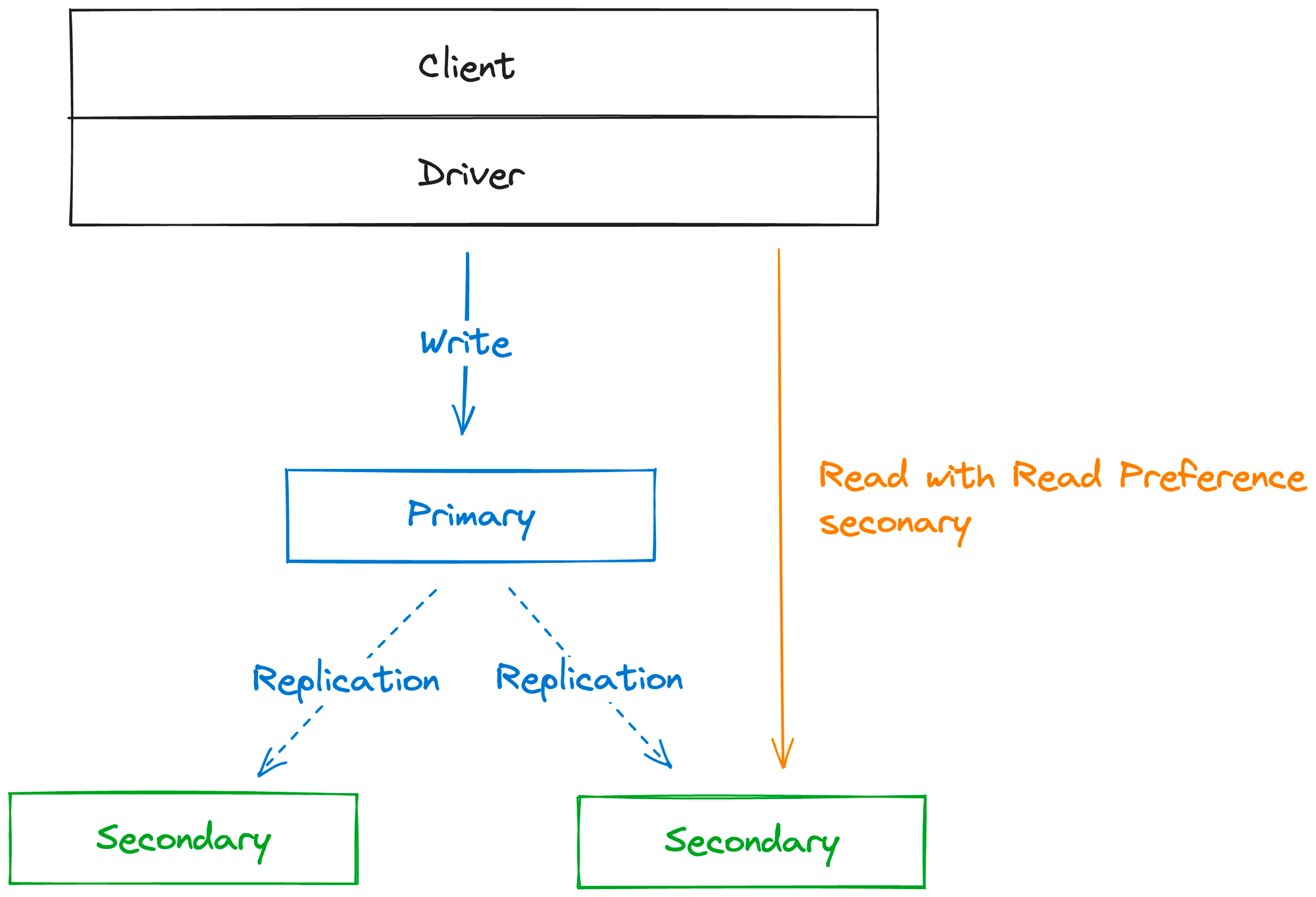 • Replica Set에 여러개가 존재할 수 있다.아무런 설정없이 읽기/쓰기 요청을 하면 기본적으로 Primary가 처리한다. readPreference 옵션을 넣어 요청해야한다.